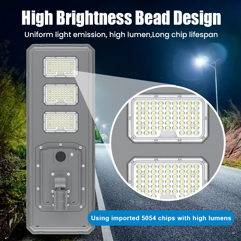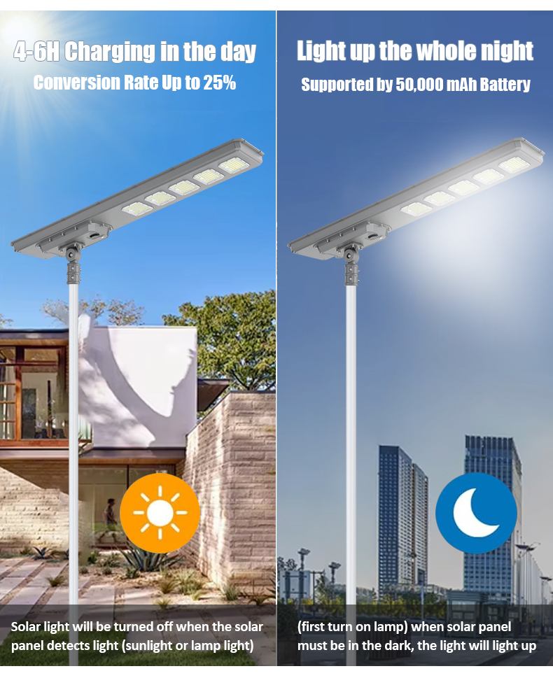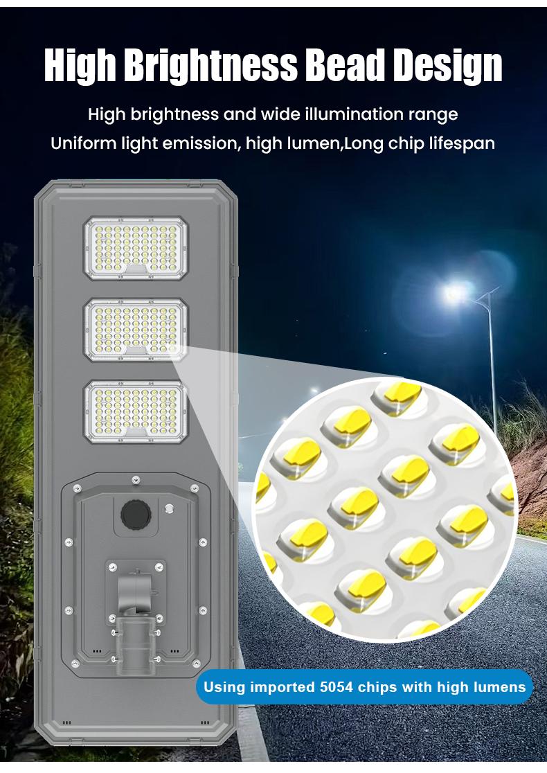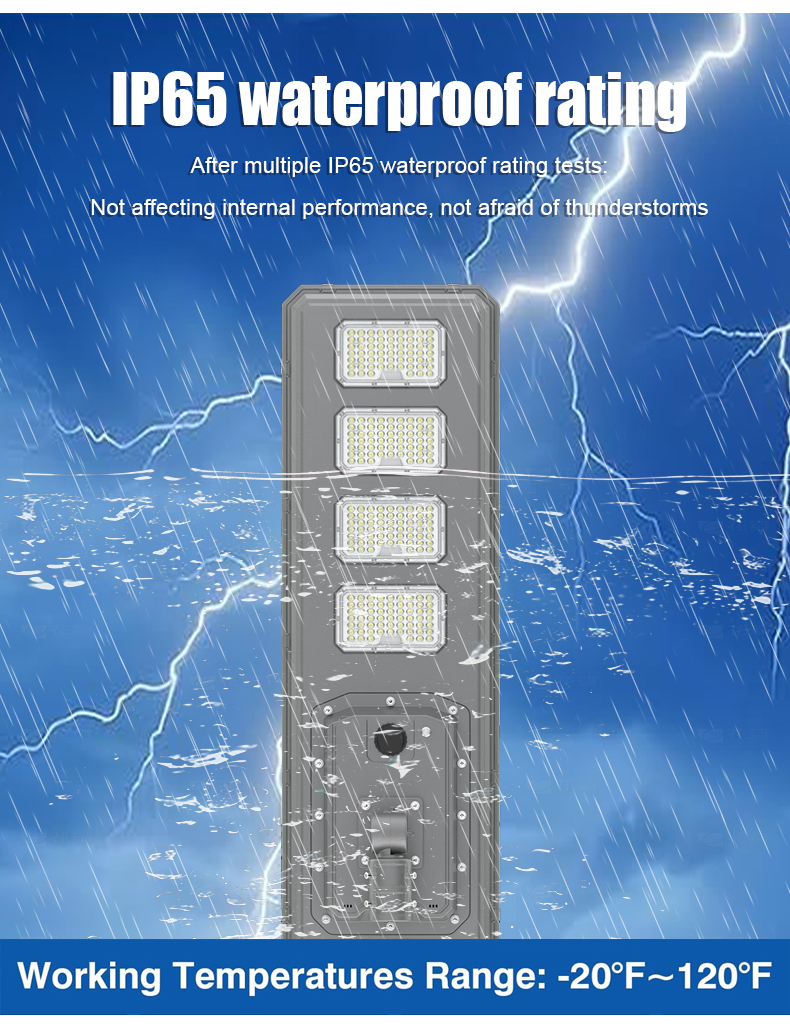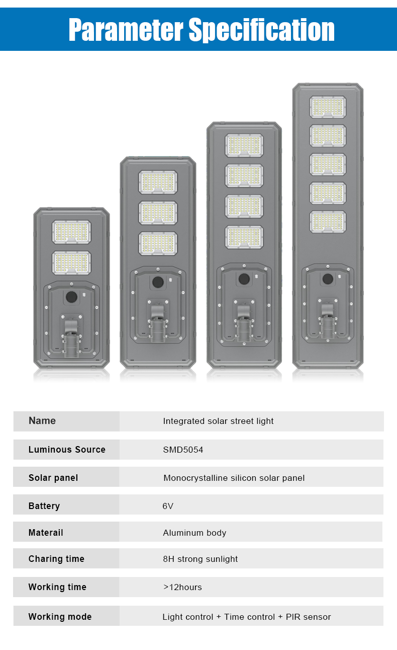 | HZ-TY-034B 250W | 1.LED :SMD5054 3000pcs 2.Material: Aluminum alloy 3.Waterproof grade: IP65 4.Charging time:8H strong sunlight 5.Light model : Light control + Time control + PlR sensor The lamp automatically turn on after sunset , and off when sunrise. Working mode Alternative working mode : Dusk to dawn automatically + Time control + Steady 6.Working time :All light >8hours, Raining days 3-4days 7.Beam angle :120° 8.Color:3000-7000K 9.Light pole diameter: 60-80mm 10.Stroage temperature :0-55° 11.Operating Humidity 90RH% 12.Discharge temperature :-10~60° ° |