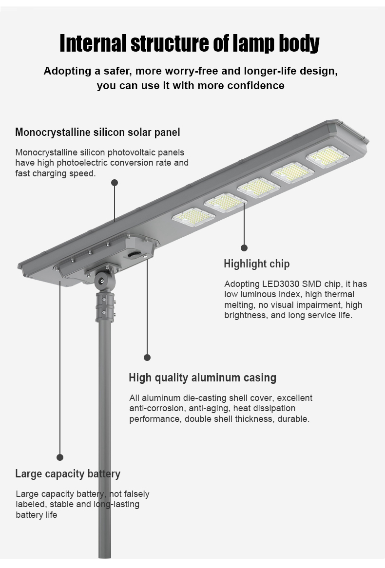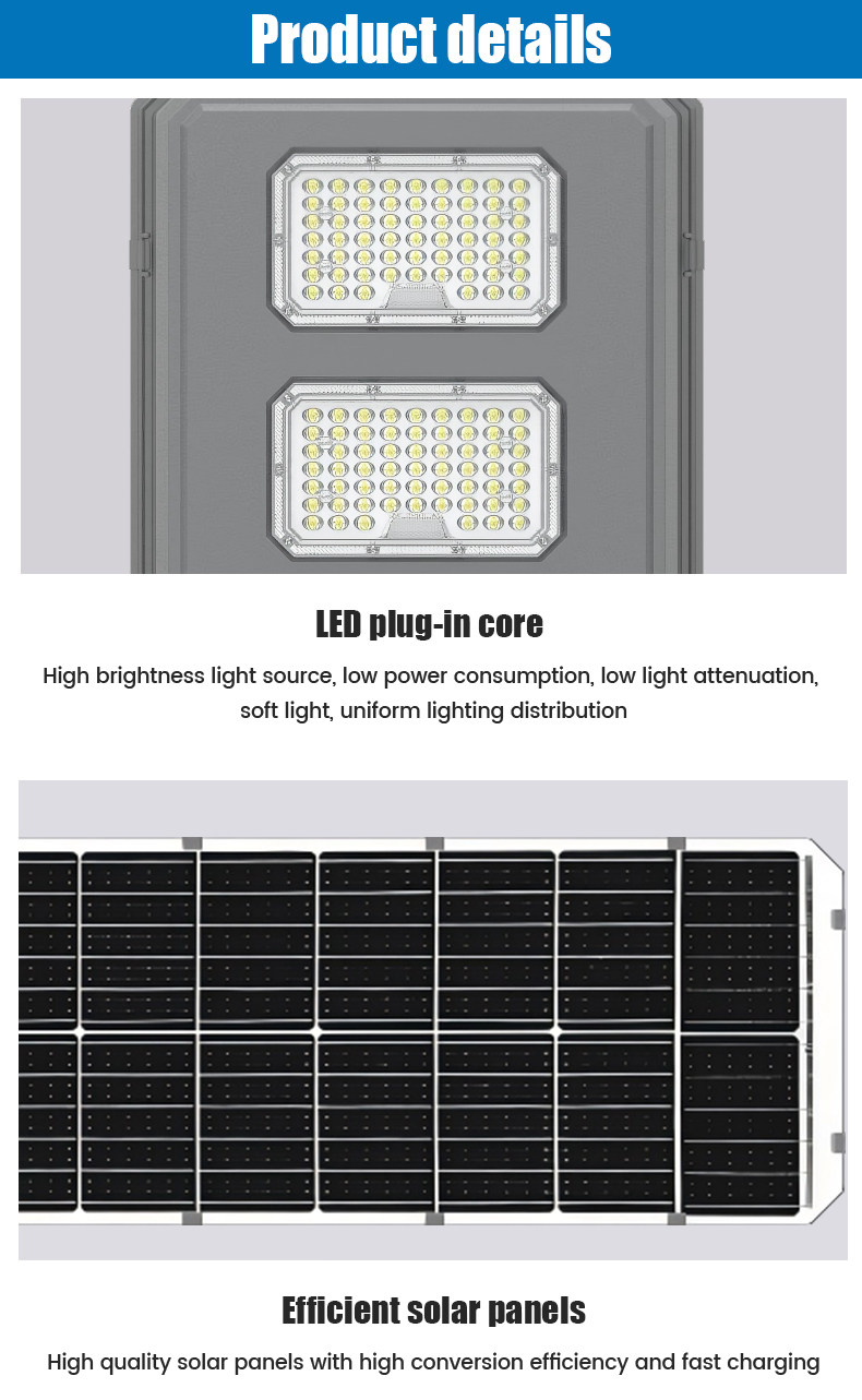 | HZ-TY-034B 100W | 1.LED : SMD5054 120pcs 2.Material: Aluminum alloy 3.Waterproof grade: IP65 4.Charging time:8H strong sunlight 5.Light model : Light control + Time control + PlR sensor The lamp automatically turn on after sunset , and off when sunrise. Working mode Alternative working mode : Dusk to dawn automatically + Time control + Steady 6.Working time :All light >8hours, Raining days 3-4days 7.Beam angle :120° 8.Color:3000-7000K 9.Light pole diameter: 60-80mm 10.Stroage temperature :0-55° 11.Operating Humidity 90RH% 12.Discharge temperature :-10~60° |