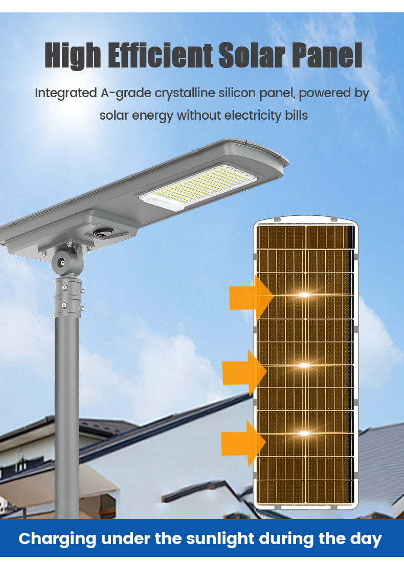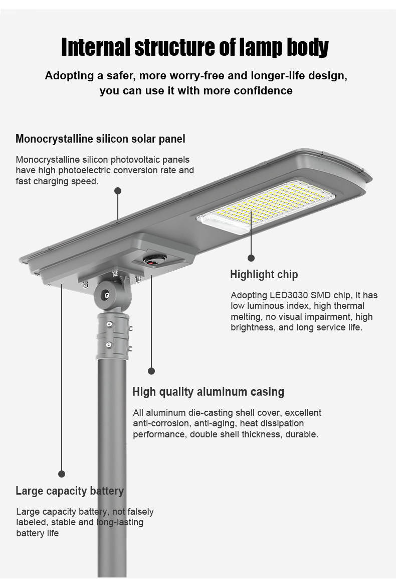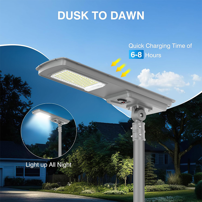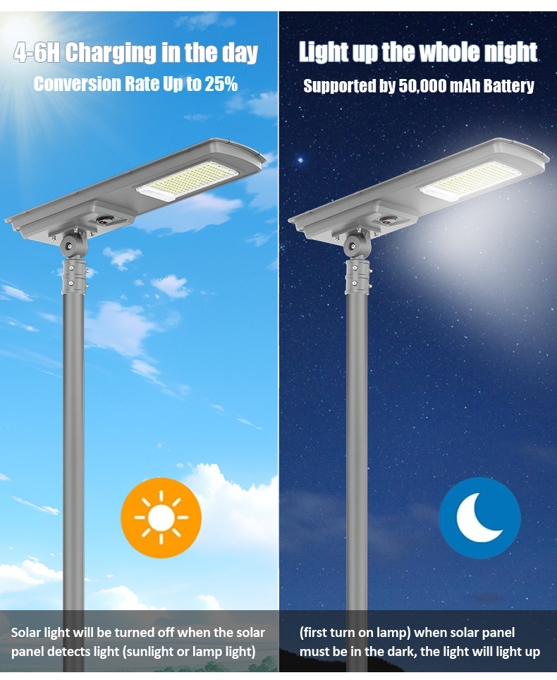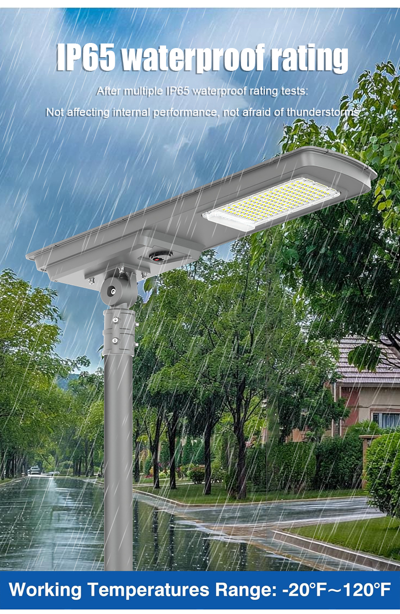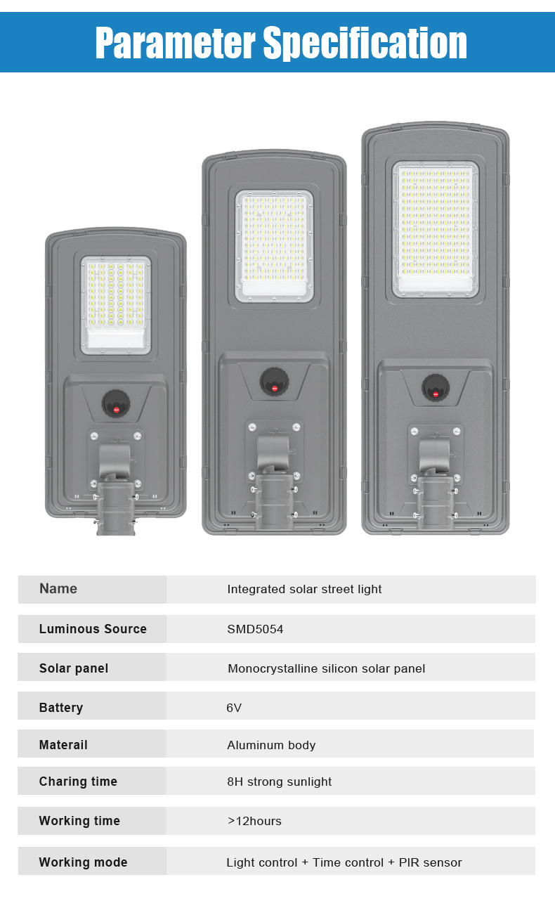 | HZ-TY-035 150W | 1.LED :SMD5054 150pcs 2.Material: Aluminum alloy 3.Waterproof grade: IP65 4.Charging time:8H strong sunlight 5.Light model : Light control + Time control + PlR sensor The lamp automatically turn on after sunset , and off when sunrise. Working mode Alternative working mode : Dusk to dawn automatically + Time control + Steady 6.Working time :All light >8hours, Raining days 3-4days 7.Beam angle :120° 8.Color:3000-7000K 9.Light pole diameter: 60-80mm 10.Stroage temperature :0-55° 11.Operating Humidity 90RH% 12.Discharge temperature :-10~60° ° |