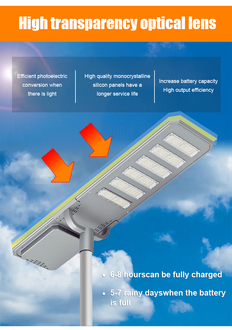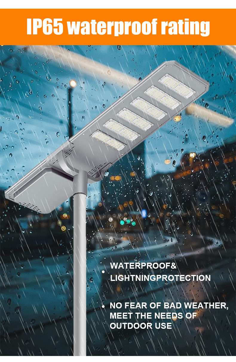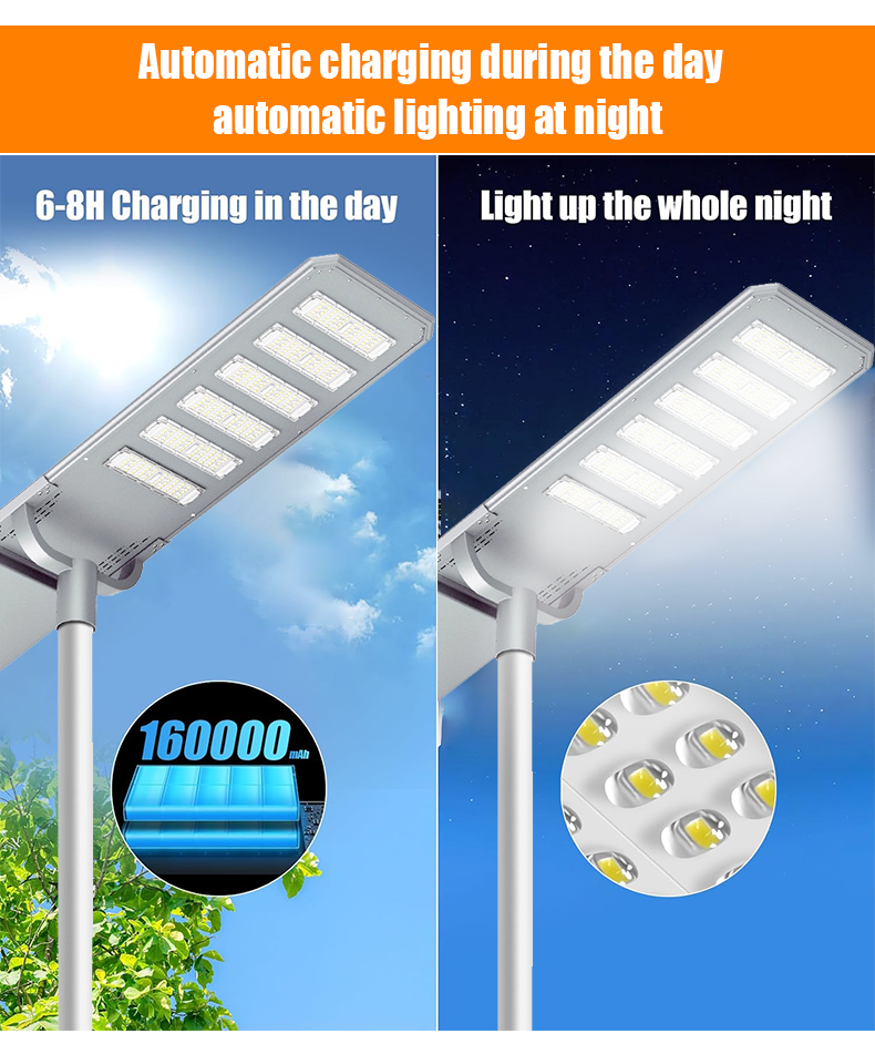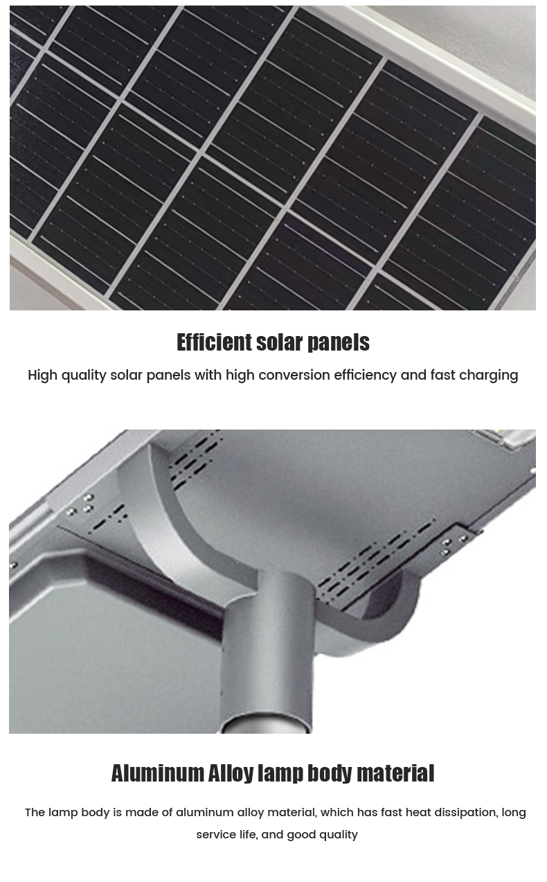 | HZ-TY-0011 150W | 1.LED :SMD 3030 2.Material: Aluminum alloy 3.Waterproof grade: IP65 4.Charging time:8H strong sunlight 5.Light model :Light Control +Time Control 6.Working time :All light >8hours, Power saving mode>24hours Raining days 2-3days 7.Beam angle :120° 8.Color:3000-7000K 9.Light pole diameter:40-76mm 10.Stroage temperature :0-55° 11.Operating Humidity 90RH% 12.Discharge temperature :-10~60° 13.Warranty 3years 14: 60mm Install hole |