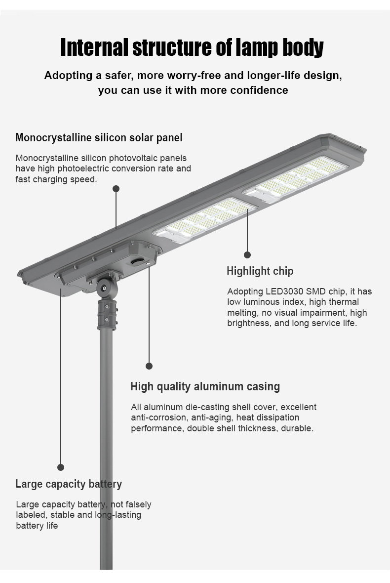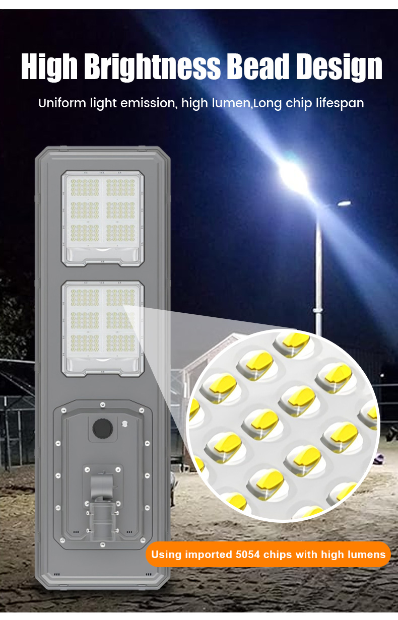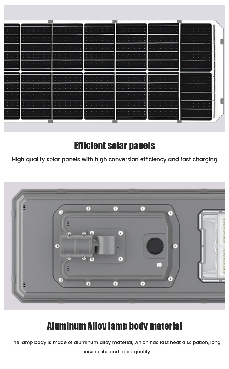 | HZ-TY-034 200W | 1.LED :SMD5054 240pcs 2.Material: Aluminum alloy 3.Waterproof grade: IP65 4.Charging time:8H strong sunlight 5.Light model : Light control + Time control + PlR sensor The lamp automatically turn on after sunset , and off when sunrise. Working mode Alternative working mode : Dusk to dawn automatically + Time control + Steady 6.Working time :All light >8hours, Raining days 3-4days 7.Beam angle :120° 8.Color:3000-7000K 9.Light pole diameter: 60-80mm 10.Stroage temperature :0-55° 11.Operating Humidity 90RH% 12.Discharge temperature :-10~60° ° |