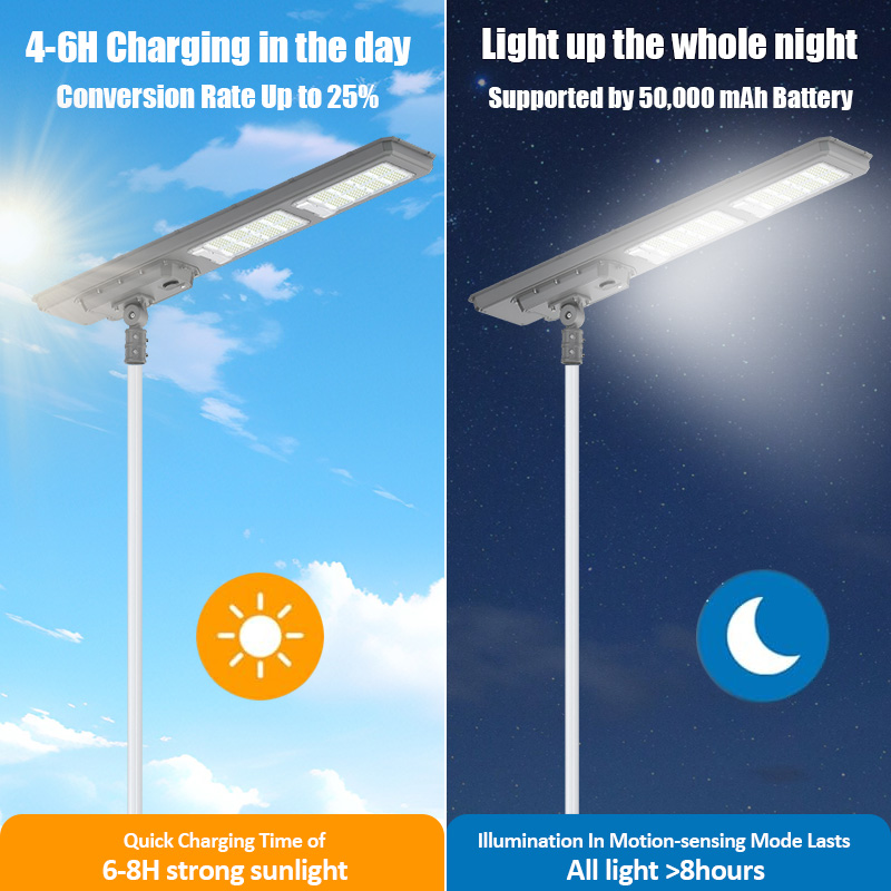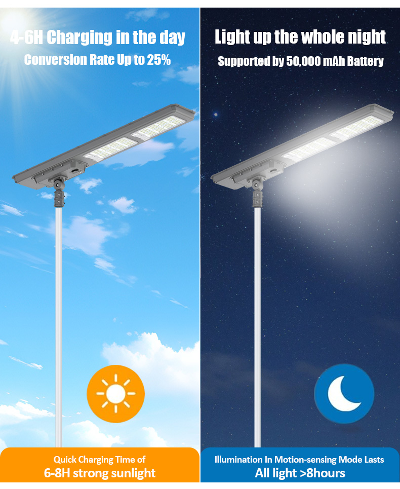 | HZ-TY-033 250W | 1.LED :SMD5054 320pcs 2.Material: Aluminum alloy 3.Waterproof grade: IP65 4.Charging time:8H strong sunlight 5.Light model : Light control + Time control + PlR sensor The lamp automatically turn on after sunset , and off when sunrise. Working mode Alternative working mode : Dusk to dawn automatically + Time control + Steady 6.Working time :All light >8hours, Raining days 3-4days 7.Beam angle :120° 8.Color:3000-7000K 9.Light pole diameter: 60-80mm 10.Stroage temperature :0-55° 11.Operating Humidity 90RH% 12.Discharge temperature :-10~60° ° |