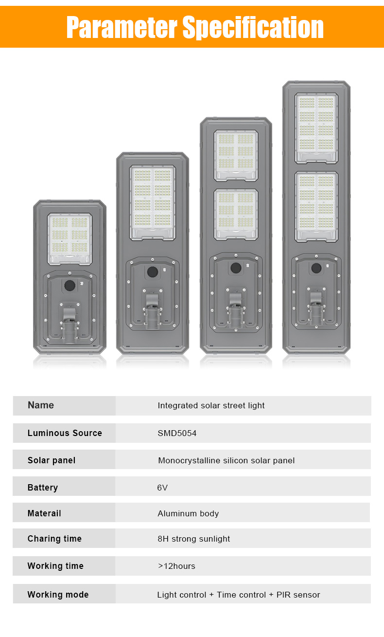 | HZ-TY-034 100W | 1.LED : SMD5054 120pcs 2.Material: Aluminum alloy 3.Waterproof grade: IP65 4.Charging time:8H strong sunlight 5.Light model : Light control + Time control + PlR sensor The lamp automatically turn on after sunset , and off when sunrise. Working mode Alternative working mode : Dusk to dawn automatically + Time control + Steady 6.Working time :All light >8hours, Raining days 3-4days 7.Beam angle :120° 8.Color:3000-7000K 9.Light pole diameter: 60-80mm 10.Stroage temperature :0-55° 11.Operating Humidity 90RH% 12.Discharge temperature :-10~60° |