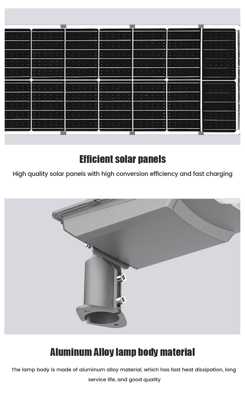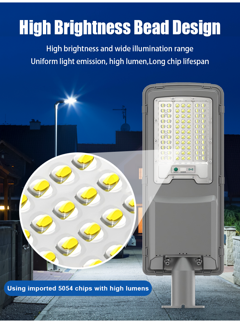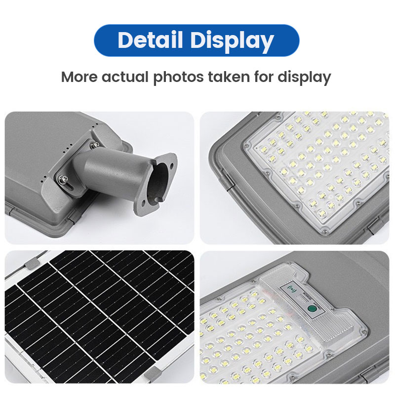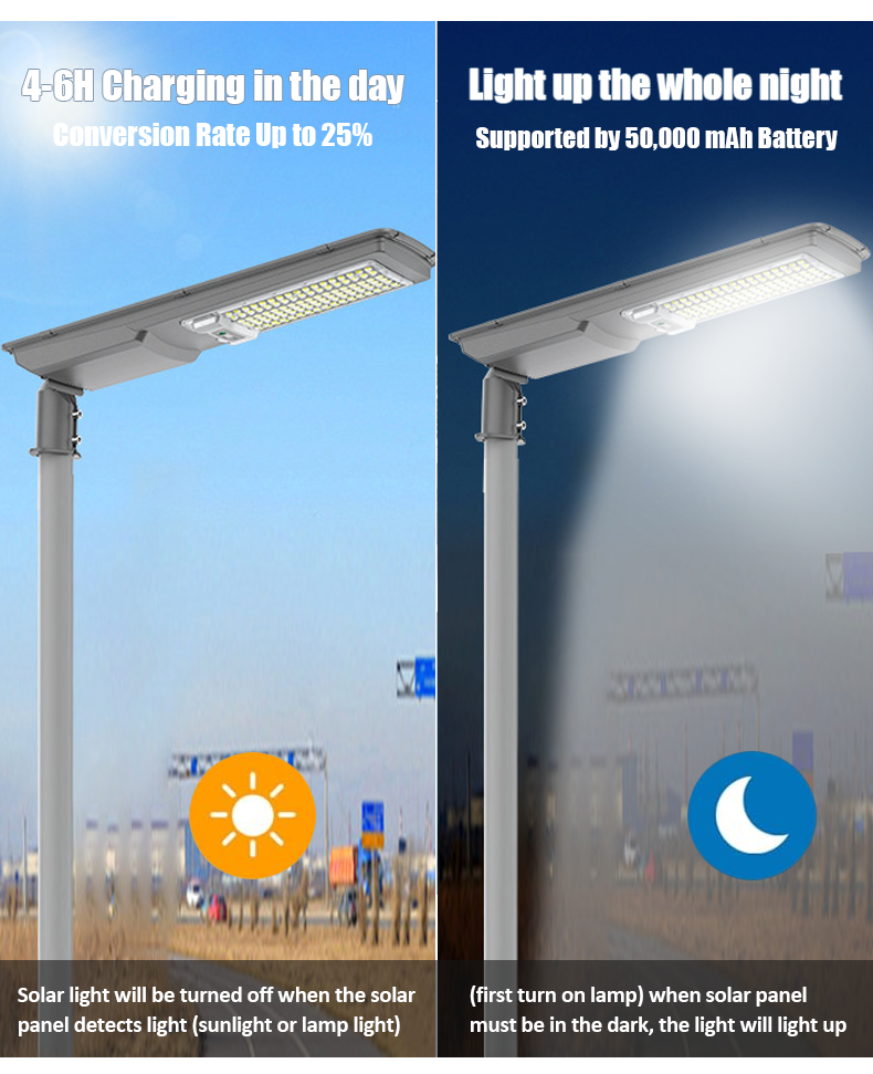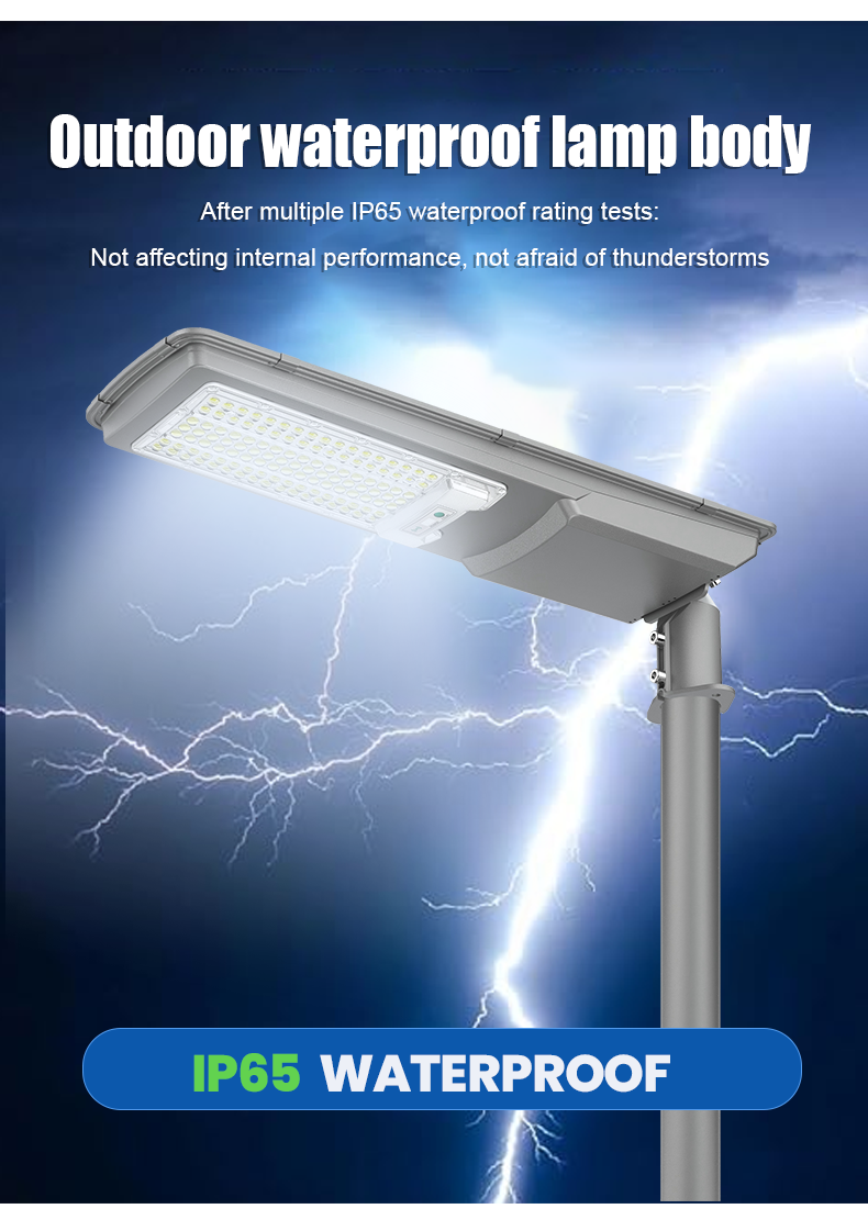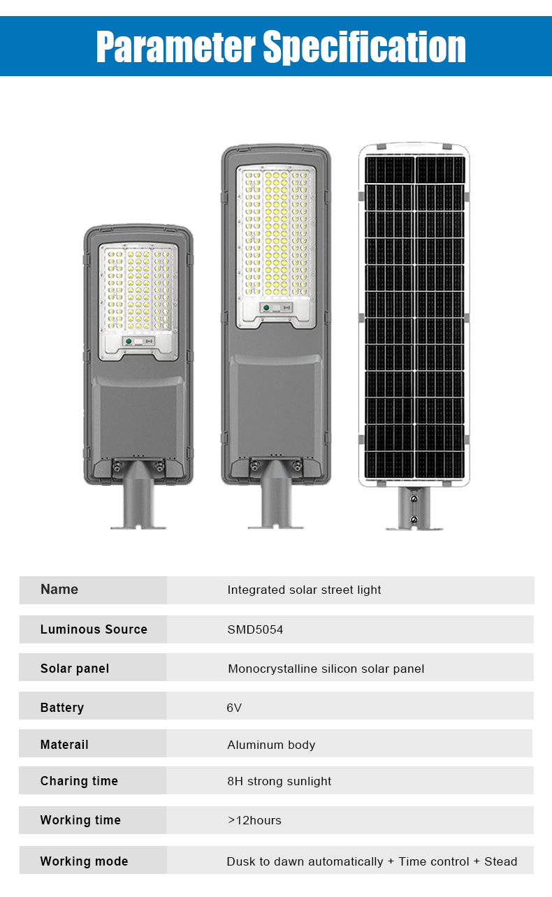 | HZ-TY-036 100W | 1.LED :SMD5054 1119pcs 2.Material: Aluminum alloy 3.Waterproof grade: IP65 4.Charging time:8H strong sunlight 5.Light model : Light control + Time control + PlR sensor The lamp automatically turn on after sunset , and off when sunrise. Working mode Alternative working mode : Dusk to dawn automatically + Time control + Steady 6.Working time :All light >8hours, Raining days 3-4days 7.Beam angle :120° 8.Color:3000-7000K 9.Light pole diameter: 60-80mm 10.Stroage temperature :0-55° 11.Operating Humidity 90RH% 12.Discharge temperature :-10~60° ° |