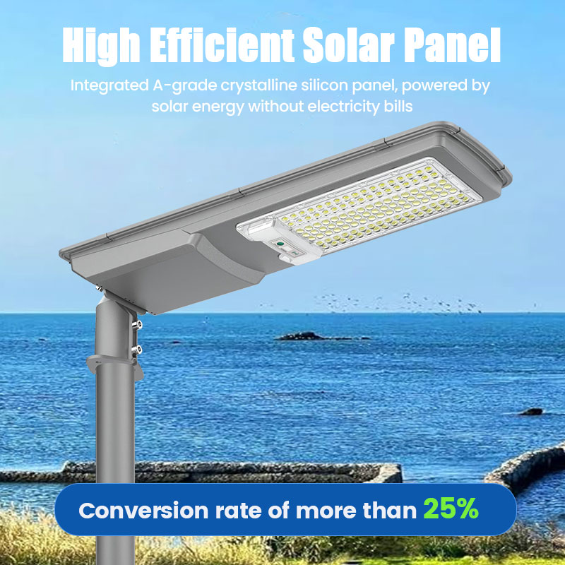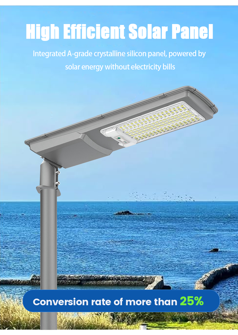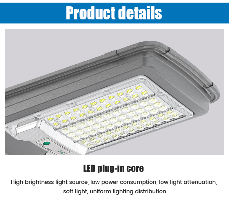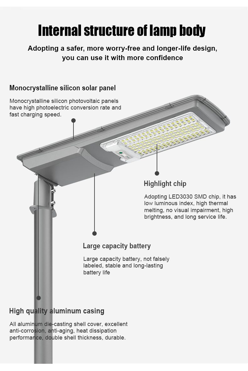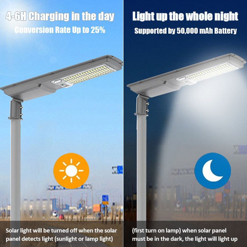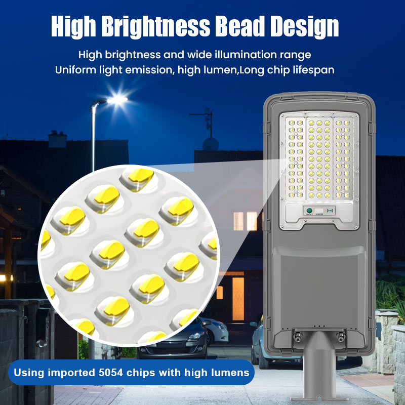 | HZ-TY-036 100W | 1.LED :SMD5054 1119pcs 2.Material: Aluminum alloy 3.Waterproof grade: IP65 4.Charging time:8H strong sunlight 5.Light model : Light control + Time control + PlR sensor The lamp automatically turn on after sunset , and off when sunrise. Working mode Alternative working mode : Dusk to dawn automatically + Time control + Steady 6.Working time :All light >8hours, Raining days 3-4days 7.Beam angle :120° 8.Color:3000-7000K 9.Light pole diameter: 60-80mm 10.Stroage temperature :0-55° 11.Operating Humidity 90RH% 12.Discharge temperature :-10~60° ° |